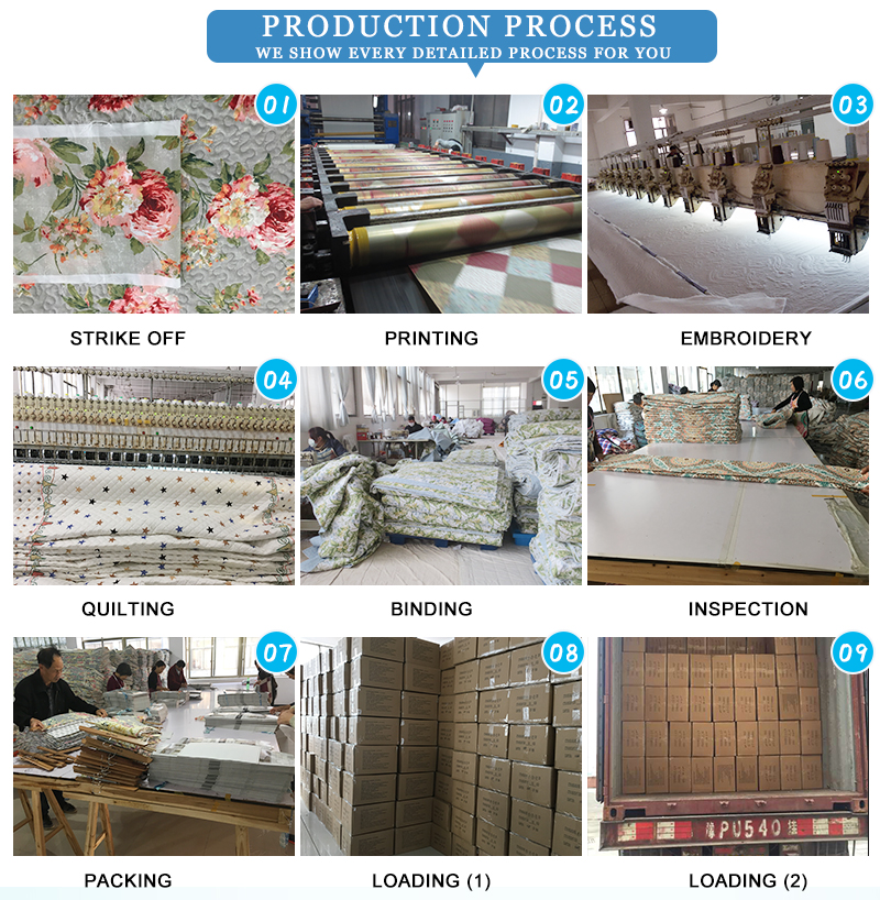 Çin'in ev tekstili endüstrisindeki en iyi OEM fabrikalarından biri olan cxmicrotex, baskılı yorganlar, patchwork yorganlar, işlemeli yorganlar, yatak örtüleri, pin-sonic yorganlar, taş yıkanmış yorganlar, nevresim örtüleri, battaniyeler, duş gibi çeşitli nevresim takımı özel hizmetlerini kabul edebilir. perde, saçak vb. Lütfen bizimle iletişime geçmekten çekinmeyin, size en iyi fiyatı vereceğiz.